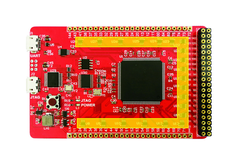 88個開放IO全部帶有ESD防護(hù)芯片(圖片中黃色區(qū)域芯片),防止損壞